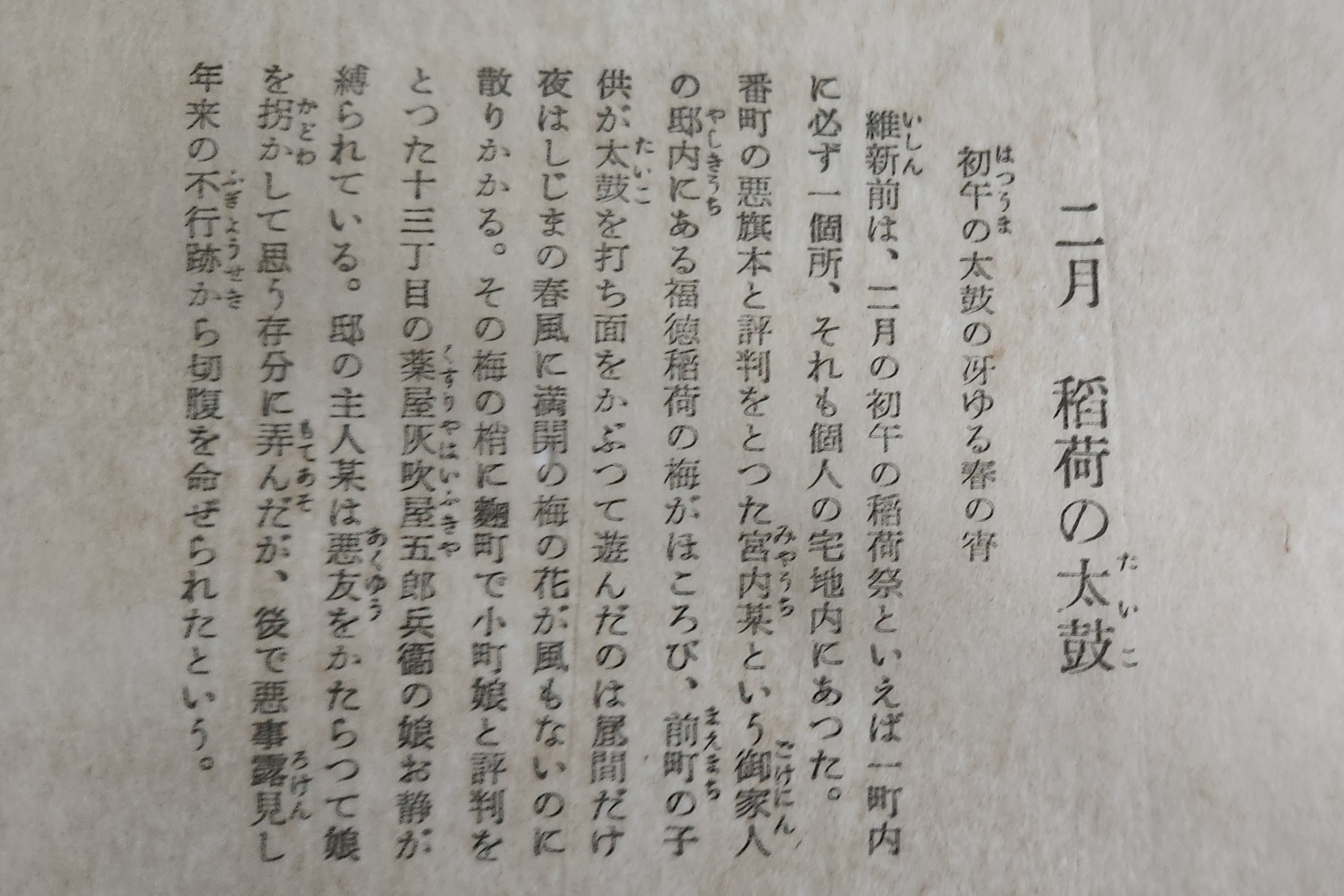 Near an Inari shrine on the estate of a certain bannerman named Miyauchi—who had a reputation as a wicked hatamoto—the children of the neighboring town would spend their days beating drums and playing about. But only in the daytime. At night, in the stillness, the spring breeze carried the fully blooming plum blossoms, which seemed to fall even without wind.