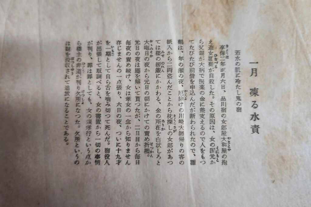 On the sixth day of the first month of the second year of Kyōhō, a courtesan employed by the brothel Yamato-ya in Shinagawa-juku killed herself. Her parents were gravely ill, and because she needed money for medicine, she repeatedly sought an advance, but was refused. On a year-end night, two ryō were stolen from the purse of a guest returning from Kawasaki Daishi, and suspicion fell within the brothel. She was forced to confess the whereabouts of the money and was tortured from New Year’s Eve night into New Year’s morning. Though her ropes were removed the first night, from the second day onward the torture continued every night. As a filial daughter, she held firmly to a single answer: “I do not know.” On the night of the sixth, at the age of nineteen, she bit through her own tongue and died. When officials investigated, everything became clear from the note she had left. Even if the theft itself were treated as a crime, it became evident that the treatment she had suffered was gravely unjust in light of her filial devotion. The responsible officials were punished and dismissed.